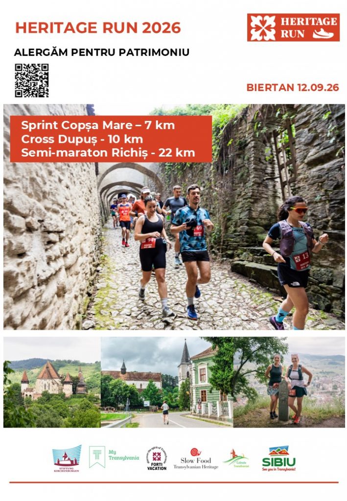 Heritage Run este un concurs destinat celor pasionați de alergare care își doresc să se implice, prin simpla lor participare, și în eforturile de păstrare a unor monumente istorice. Având curse propuse între 7 și 22 de km, concursul este deschis tuturor categoriilor de practicanți ai alergării în natură. Traseul între cele patru biserici fortificate este unul variat cu porțiuni întinse de pădure în zona colinară a Târnavelor. Vom alerga pe drumuri de țară, poteci înguste marcate de Via Transilvanica, Colinele Transilvaniei și Mediaș Bike Marathon dar și prin curtea bisericilor fortificate în sine începând cu cea din Biertan, aflată pe lista patrimoniului UNESCO.